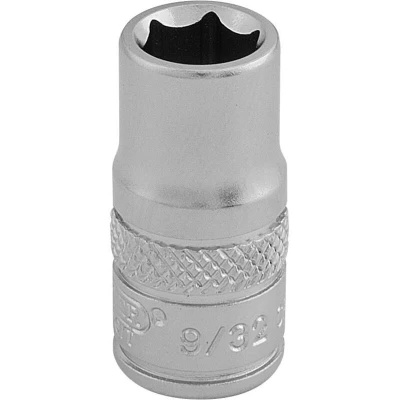 General description This is a 1/4 inch square drive imperial socket designed for 9/32 inch fasteners. It is suitable for use with various hand tools for home improvement and DIY projects. The socket features a 6-point design for a secure grip on fasteners, reducing the risk of slipping or rounding corners. Made from chrome vanadium steel, it offers durability and strength for demanding tasks. The polished finish provides corrosion resistance and a professional appearance. The socket includes a knurled ring for enhanced grip during use. Technical specifications Size: 9/32 inch Drive size: 1/4 inch square Type: 6-point socket Material: Chrome vanadium steel Finish: Polished chrome Manufactured according to DIN3122 and ISO3315 standards Compatibility and accessories Compatible with 1/4 inch drive ratchets and extensions Suitable for use with other 1/4 inch drive tools Installation Insert the socket onto a compatible 1/4 inch drive ratchet or wrench Ensure it clicks securely into place
