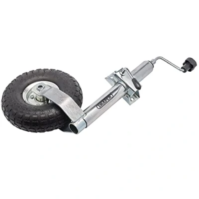 General description This steel jockey wheel features a heavy-duty pneumatic wheel with a diameter of 260mm, designed to provide stability and support for trailers during positioning and movement. It is suitable for use when hitched or unhitched, helping to maneuver trailers easily and safely. The wheel is equipped with a height adjustment handle for convenient operation and a zinc-plated finish to resist corrosion. Technical specifications Wheel dimensions: 260 x 85mm Travel height: 240mm Maximum load capacity: 136kg Net weight: 5kg Compatibility and accessories Designed to fit trailers with a 48mm clamp. Installation Attach the jockey wheel to the trailer's support frame using the 48mm clamp. Adjust the height as needed using the handle for optimal support and stability. Usage Use the jockey wheel to move and position trailers easily, whether hitched or unhitched. Adjust the height to match the trailer's support points for secure handling. Other information The zinc-plated finish