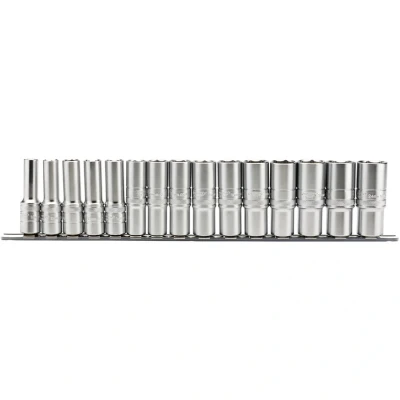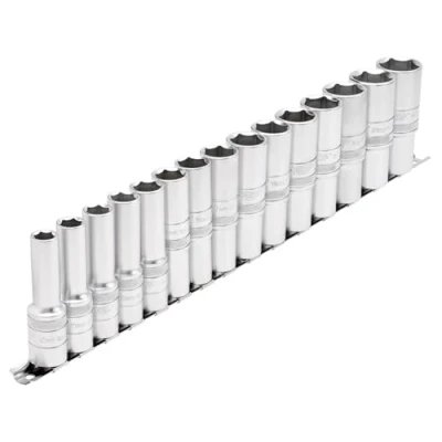 General description This is a set of 15 metric deep sockets with a 1/2" square drive, supplied on a metal rail for easy storage. Made from chrome vanadium steel, these sockets are hardened and tempered for durability. Each socket features a micro satin chrome finish and a knurled ring for improved grip. The set is designed for professional use. Technical specifications Number of pieces: 15 Drive size: 1/2" square Material: Chrome vanadium steel Finish: Micro satin chrome Manufactured according to DIN3122 and ISO3315 standards Compatibility and accessories Compatible with 1/2" drive ratchets and extension bars Supplied with a metal socket rail for secure storage and organization Installation Simply place the sockets onto compatible ratchets or extensions as needed Usage Ideal for automotive, machinery, and home repair tasks requiring deep sockets Provides a secure grip with knurled rings for better handling during use Other information Expert quality tools designed for professional and