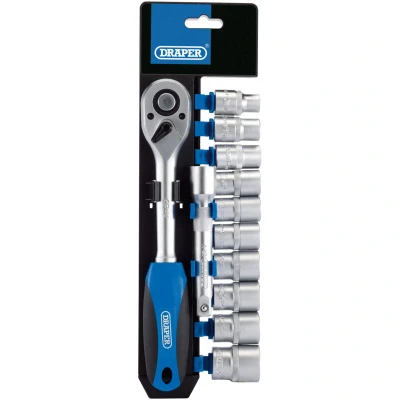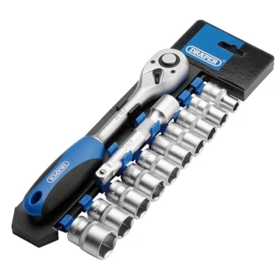 General description This Draper 12-Piece 1/2' Square Drive Metric Socket and Ratchet Set (Model 16374) is designed for durability and versatility. Made from chrome vanadium steel that is hardened and tempered, it features a satin finish for corrosion resistance. The set includes a 72-tooth reversible soft grip ratchet and a 100mm extension bar, making it suitable for various DIY and home improvement tasks. It is conveniently packaged on a plastic hanging rack, which can also be used for storage in a toolbox. Technical specifications Material: Chrome vanadium steel Finish: Satin Ratchet: 72-tooth reversible soft grip Extension bar length: 100mm Compatibility and accessories Compatible with standard sockets Includes a reversible ratchet and extension bar for added flexibility Installation No installation required; ready to use out of the box Usage Suitable for tightening and loosening fasteners in various DIY and home improvement projects Reversible ratchet allows for easy switching
