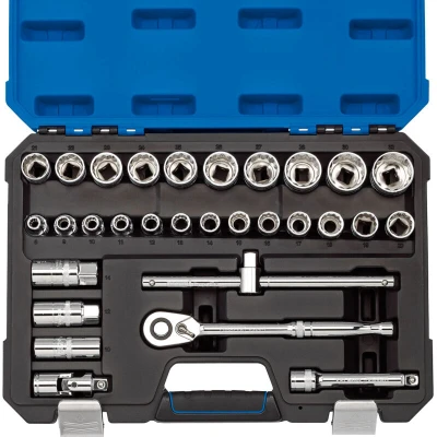 General description High-quality twelve-point sockets made from chrome vanadium steel, which is hardened and tempered for durability. Each socket features a polished finish and a knurled ring for improved grip. The set includes a variety of sizes suitable for different applications and comes with a 72-tooth reversible ratchet with a quick-release mechanism, providing smooth operation and ease of use. The set is stored in a sturdy plastic case with a soft grip handle for convenient transport and organization. Technical specifications Material: Chrome vanadium steel, hardened and tempered Finish: Polished Socket sizes: 8mm to 32mm, including 3 spark plug sockets (10mm, 12mm, 14mm) Ratchet: 72-tooth reversible with quick-release button Accessories: Wobble extension bar (125mm), sliding T-bar, universal joint Compatibility and accessories Compatible with standard 1/2-inch drive tools Includes various sockets, extension bar, T-bar, and universal joint for versatile use Installation Attach