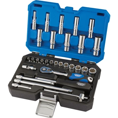 General description This is a high-quality 30-piece metric socket set designed for professional and DIY use. Made from hardened and tempered chrome vanadium steel, the sockets feature a micro satin finish for durability and corrosion resistance. The set includes both standard and deep sockets, all with six points for a secure grip on fasteners. It comes with a 72-tooth reversible ratchet with a soft grip handle and quick-release mechanism, along with various accessories for versatile use. Packaged in a sturdy plastic storage case for easy organization and transport. Technical specifications Material: Chrome vanadium steel Finish: Micro satin Number of sockets: 13 standard (4mm to 14mm), 10 deep (5mm to 14mm) Ratchet: 72-tooth reversible with soft grip handle Extensions: 50mm, 100mm, 150mm wobble extension bars Additional tools: Sliding 'T' bar, universal joint, spinner handle Compatibility and accessories Compatible with various fasteners requiring metric sizes from 4mm to 14mm