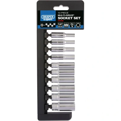 General description This 1/4" drive deep socket set includes 10 pieces designed for versatile use with various fasteners. Made from chrome vanadium steel, these sockets are hardened and tempered for durability and feature a micro satin chrome finish to resist corrosion. Each socket has a knurled ring for a secure grip during use. The Multi-Drive® design allows compatibility with metric and imperial hexagon, bi-hexagon, spline, and Draper TX-STAR fixings, making them suitable for a wide range of applications. The set is supplied on a plastic hanging rail for easy storage and organization. Technical specifications Set includes: 10 deep sockets Drive size: 1/4 inch Material: Chrome vanadium steel Finish: Micro satin chrome Manufactured according to DIN3122 and ISO3315 standards Compatibility and accessories Compatible with metric and imperial hexagon, bi-hexagon, spline, and Draper TX-STAR fixings Supplied with a plastic hanging rail for storage Installation Insert the socket onto a