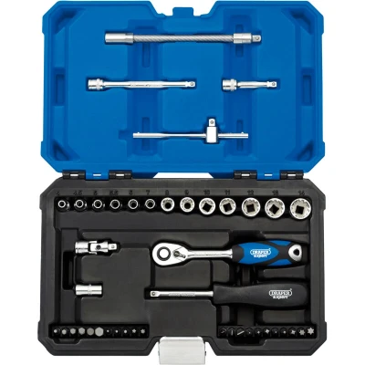 General description This is a high-quality set of Multi-Drive® sockets made from chrome vanadium steel, which is hardened and tempered for durability. The sockets feature a micro satin finish for smooth handling and are compatible with hexagon, bi-hexagon (metric and AF), and Draper TX-STAR® fixings. The set includes various accessories for versatile use, making it suitable for a wide range of DIY and home improvement tasks. Technical specifications Includes 13 sockets: 4, 4.5, 5, 5.5, 6, 7, 8, 9, 10, 11, 12, 13, 14mm Supplied with a 72-tooth reversible ratchet with a soft grip handle and quick-release button Includes 2 wobble extension bars (50mm and 100mm), a flexible extension bar, and a sliding 'T' bar Universal joint and spinner handle included Bit holder compatible with 1/4" square drive bits Insert bits included: plain slot (3, 4.5, 7mm), cross slot (No.1, No.2, No.3), PZ-Type (No.1, No.2, No.3), Draper TX-STAR® (T8, T10, T15, T20, T25, T30, T40), and hexagonal bits (3, 4, 5,