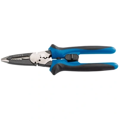 Expert Quality, multifunctional electrical installation plier. 6 functions in one pair of pliers. Capable of shearing medium hard wire, stripping 0.75 to 4.0mm� wire, crimping 0.75 to 4.0mm� terminals, cutting M3.5 & M4 bolts and fitted with a wire looping device at the tips. Manufactured from chrome vanadium steel that's hardened and tempered for extra strength and attached with precision ground stripping holes and separately induction hardened cutting edges.