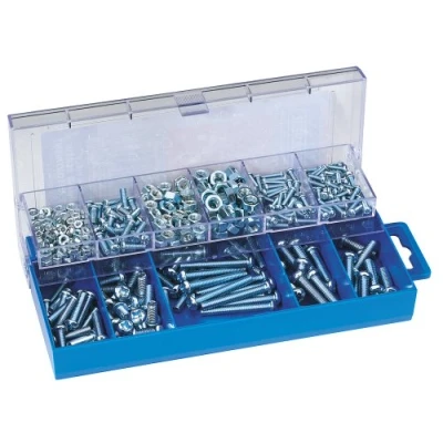 General description This product is an assortment of popular size panhead screws and hexagon nuts with a plated finish for corrosion protection. It is designed for various DIY and home improvement projects, providing a convenient set of fasteners in one package. Technical specifications Contains 366 pieces of panhead screws and hexagon nuts Made with a plated finish to resist corrosion Dimensions of the storage case: 205 x 105 x 45 mm Compatibility and accessories Suitable for use with various materials and projects requiring standard fasteners Includes a plastic storage case with a transparent lid for easy organization and access Installation Use appropriate tools such as screwdrivers or wrenches to install screws and nuts Ensure the correct size and type of fastener are used for your specific application Usage Ideal for assembling, repairing, or fastening components in DIY and home improvement tasks Keep the set organized in the storage case for quick access during projects
