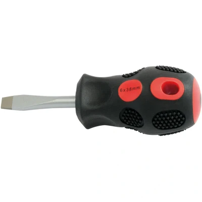 General description Expert quality screwdriver with a 6mm x 38mm plain slot flared tip. Features hardened SVCM satin chrome plated blades and sand blasted tips for durability and performance. Handle made from vulcanized 'soft grip' polymer for comfort and ease of use, color-coded for easy recognition.