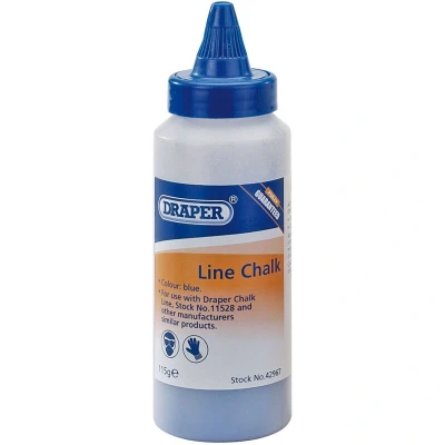 General description This is a plastic bottle of fine blue chalk designed for use with chalk lines from Draper and other manufacturers. It is suitable for marking straight lines on various surfaces, making it ideal for DIY and home improvement projects. Technical specifications Weight: 115 grams (0.139 kg) Color: Blue (other colors available) Material: Plastic Compatibility and accessories Compatible with Draper chalk lines and other brands Supplied with a funnel for easy filling Installation Fill the chalk line with the chalk from the bottle using the included funnel Usage Pour the chalk into the chalk line reel or dispenser Use the chalk line to mark straight lines on surfaces such as wood, concrete, or drywall
