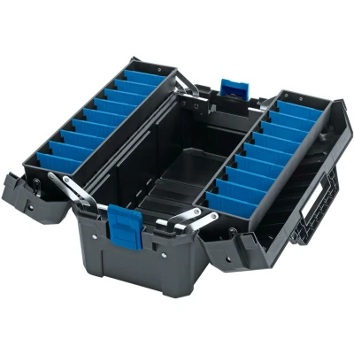 General description This plastic cantilever toolbox is a versatile and durable storage solution designed for organizing tools and accessories. Its innovative design allows for flexible storage with removable dividers and easy access to contents. Suitable for various trade environments, it provides secure and efficient tool management. Technical specifications Material: Moulded plastic with heavy-duty metal hinges Dimensions: 454 mm (length) Number of removable dividers: 18 Features: Padlock hole for security, plastic catches, metal cantilever hinges Compatibility and accessories Compatible with standard tools and accessories Includes 18 removable dividers for customizable storage Installation No installation required; ready to use out of the box Usage Use the removable dividers to organize different tools and parts Open the cantilever trays by releasing the plastic catches for easy access Secure the toolbox with a padlock for added security during transport or storage Other
