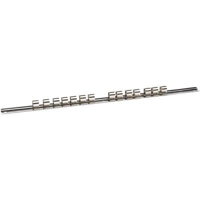 General description This is a 1/2-inch square drive retaining bar designed for socket tools. It includes 14 clips and measures 400mm in length. The bar can be used either as a wall-mounted holder or as a loose tool. Made from hardened and tempered carbon steel, it features a polished finish for durability and corrosion resistance. The clips are crafted from nickel-plated spring steel, ensuring secure retention of sockets. Technical specifications Material: Hardened and tempered carbon steel Finish: Polished Drive size: 1/2 inch Number of clips: 14 Length: 400mm (approximately 16 inches) Compatibility and accessories Compatible with 1/2-inch drive sockets Includes clips for socket retention Installation Can be wall-mounted for organized storage Mounting options depend on user preference; suitable for workshop or garage use Usage Use to securely hold and organize 1/2-inch drive sockets Suitable for professional or DIY tool storage Other information Manufactured from durable materials