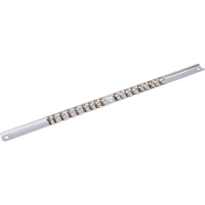 General description These socket retaining bars are designed for secure storage and easy access to sockets. They can be wall-mounted or used as loose tools, offering versatile storage options. Made from hardened and tempered carbon steel, they are durable and resistant to wear. The clips are crafted from nickel-plated spring steel for reliable grip and corrosion resistance. Technical specifications Material: Carbon steel, hardened and tempered Finish: Polished surface Type: 1/4 inch drive socket retaining bars Length: 400mm Compatibility and accessories Compatible with 1/4 inch drive sockets Includes clips made from nickel-plated spring steel for secure socket retention Installation Can be mounted on a wall using appropriate hardware Suitable for use as a standalone tool or mounted on a workbench or wall Usage Organize and store sockets securely Easy to access sockets during repair or maintenance tasks