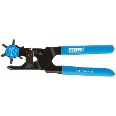 Heavy duty, pressed steel frame with plastic coated handles Revolving carbon steel head has unique waste collection facility and six punches size: 2, 2.5, 3.0, 3.5, 4.0 and 4.8mm Display packed This is a Draper product.