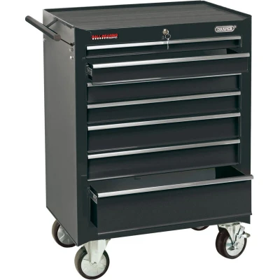 General description This is a 7-drawer roller cabinet manufactured by Draper, made from sheet steel with a durable powder-coated finish. It features a pulling handle for easy maneuverability and is equipped with two fixed and two braked heavy-duty swiveling castors for stability and mobility. The drawers are fitted with ball bearing runners for smooth operation and include protective foam liners to prevent damage to stored items. The cabinet has an integrated locking system with two keys for security and is supplied fully assembled and ready for use. Technical specifications Number of drawers: 7 Overall size: W 680 x D 458 x H 945 mm Drawer dimensions: 1 drawer: W 570 x D 410 x H 48 mm 3 drawers: W 570 x D 410 x H 74.5 mm 2 drawers: W 572 x D 408 x H 100.5 mm 1 drawer: W 570 x D 410 x H 153.5 mm Material: Sheet steel with powder coating Castors: Two fixed and two braked heavy-duty swiveling castors Compatibility and accessories Designed to store a variety of tools and small parts