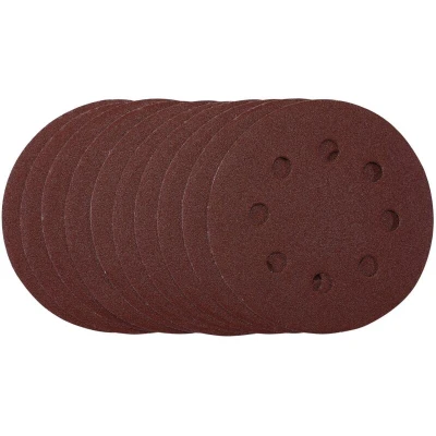 General description This pack contains 10 high-quality 115mm aluminium oxide sanding discs designed for versatile use on various surfaces. They feature resin bonding for enhanced grain adhesion, anti-static properties, and long-lasting performance. The heavy-duty E-Weight backing paper ensures durability and the ability to handle tough sanding jobs. The hook and loop backing allows for quick and easy disc changes, while the eight pre-punched 8mm holes facilitate efficient dust extraction. These discs are suitable for sanding and finishing wood, metal, aluminium alloys, painted surfaces, plastics, and fillers. Technical specifications Diameter: 115mm Grit: 120 Backing: Hook & Loop Material: Aluminium oxide Backing paper: Heavy-duty E-Weight Pre-punched holes: 8mm (8 holes) Compatibility and accessories Compatible with all 115mm orbital sanders equipped with hook and loop backing pads.