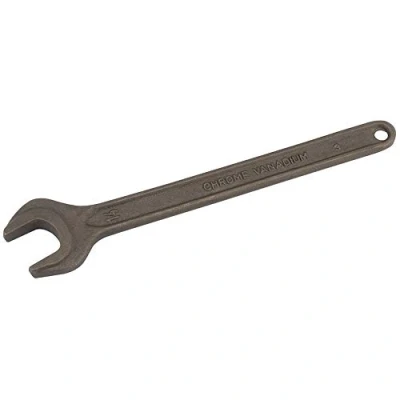 Description générale This is a 14mm single open end spanner made from durable chrome vanadium steel. It features a head angle of 15° for easier access in tight spaces. The tool is designed for gripping and turning nuts and bolts with a 14mm size. Spécifications techniques Jaw size: 14mm Material: Chrome vanadium steel Finish: Black phosphate coating Head angle: 15° Hardened and tempered for strength and durability Compatibilité et accessoires Compatible with standard 14mm nuts and bolts No additional accessories included Installation No installation required; ready to use out of the box Utilisation Use to tighten or loosen 14mm nuts and bolts Designed for manual operation in various DIY and home improvement tasks