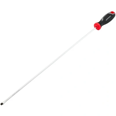 General description This slotted screwdriver is designed for both DIY enthusiasts and professionals, featuring a hardened chrome vanadium steel blade with corrosion-resistant chrome plating. The magnetic tip ensures screws are held securely for easier and more precise fastening or loosening. Technical specifications Blade length: 450 mm Blade type: Slotted Material: Chrome vanadium steel with chrome plating Tip: Magnetic with black phosphate coating Handle: Ergonomic soft grip with drive type color coding Compatibility and accessories Suitable for use with standard slotted screws Compatible with various screwdriver bits of the same drive type Installation No installation required Usage Use to tighten or loosen slotted screws Magnetic tip helps hold screws in place during work Handle design provides comfort and prevents slipping or rolling Other information Designed for general purpose use in DIY and home improvement projects.