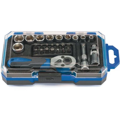 General description This 1/4" square drive socket set includes a 103mm 72-tooth reversible quick-release ratchet, a selection of sockets, and screwdriver bits. All tools are made from durable chrome vanadium steel. The set features 6-point sockets and an extension bar with a knurled finish for better grip. The ratchet handle has a soft grip for comfortable use during extended periods. It comes in a sturdy plastic storage case for easy organization and transport. Technical specifications Material: Chrome vanadium steel Ratchet: 103mm length, 72 teeth, reversible, quick-release Sockets: 6-point, sizes from 4mm to 13mm Extension bar: 50mm Screwdriver bits: various types including flat, Phillips, hex, and Torx Compatibility and accessories Compatible with 1/4" drive tools Includes a universal joint for hard-to-reach fasteners Various screwdriver bits for different applications Installation Attach the desired socket or bit to the ratchet handle by aligning the square drive and pushing