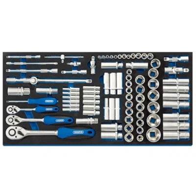 General description This 84-piece socket set includes sockets in 1/4", 3/8", and 1/2" drives, all stored in a full drawer EVA insert tray for easy organization. Made from durable chrome vanadium steel, each socket is hardened, tempered, and finished with a satin chrome coating for corrosion resistance. The set features knurled rings on sockets for extra grip and includes a variety of deep and standard sockets, along with ratchets, extension bars, universal joints, and spark plug sockets. Suitable for professional and DIY use, it is compatible with Draper and similar tool chests. Technical specifications Material: Chrome vanadium steel Finish: Satin chrome plated Drive sizes: 1/4", 3/8", 1/2" Number of sockets: 72 standard and deep sockets Ratchets: 72-tooth reversible with soft grip and quick release Additional tools: Spinner handle, universal joints, extension bars, sliding T-bar, spark plug sockets, and adapters Compatibility and accessories Compatible with Draper and Draper Expert