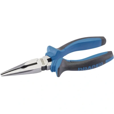 General description These Draper long nose pliers are designed for general use, made from hardened and tempered carbon steel for durability. The satin finish lacquered heads feature cutting edges that are induction hardened for improved cutting performance, making them suitable for cutting medium-hard wire up to 1.6mm in diameter. Equipped with heavy-duty soft grip handles, these pliers provide comfort and a secure grip during use. Technical specifications Material: Carbon steel, hardened and tempered Head finish: Satin lacquered Cutting capacity: Medium-hard wire up to 1.6mm diameter Handle: Heavy-duty soft grip Compatibility and accessories Designed for general electrical and DIY tasks involving cutting and manipulating wires. Installation No installation required; ready to use out of the box. Usage Use for gripping, bending, and cutting wires and small components. Apply moderate pressure for effective cutting and manipulation.