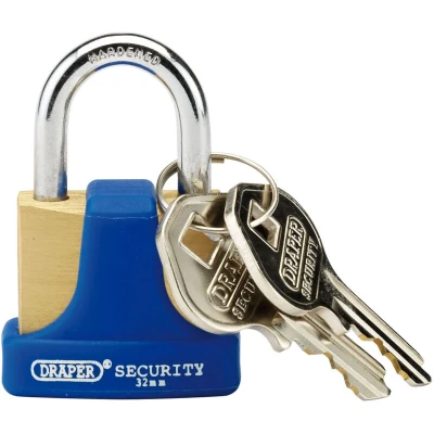 Draper Solid Brass Padlock and 2 Keys with Hardened Steel Shackle Bumper, 32mm