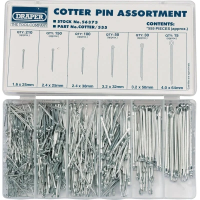 General description This Draper 555-Piece Split Pin Assortment Kit (Part No. 56375) is a durable cotter pin set designed for mechanical and automotive applications. This comprehensive set includes 555 clips suitable for various DIY and home improvement projects. Made from durable materials, these clips are designed to securely hold and fasten different components during assembly or repair tasks. Technical specifications Number of clips: 555 Material: Durable plastic or metal (depending on the clip) Size and dimensions: Varies depending on the clip type Compatibility and accessories Compatible with a wide range of DIY and home improvement applications Can be used with other tools and fasteners for versatile projects Installation Simply insert or clip into the desired position to secure components No special tools required for installation Usage Ideal for holding wires, cables, or small parts in place Suitable for organizing and securing items during assembly or repair Other information