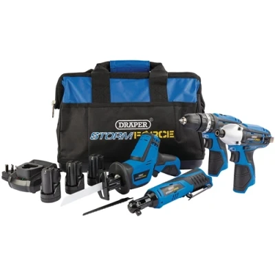 Part of the Draper Storm Force® 10.8V Interchange range, this kit comprises a combi drill with two speed gearbox and 21 torque control positions, an impact driver with 1/4" quick release collet and forward/reverse facility, a reciprocating saw with quick blade change system and a 3/8" sq. dr. reversible ratchet. Complete with 3 li-ion batteries, one - hour charger and a 420mm, water repellent, hard bottom tool bag for easy transportation and storage.