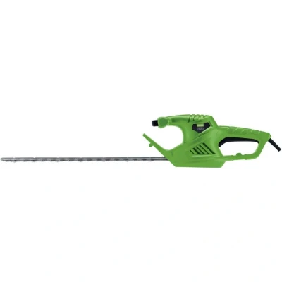 General description This lightweight hedge trimmer features high-quality 450mm long double-action blades designed for efficient trimming. It is powered by a robust 500W motor with metal gears and mechanical synchronization to enhance cutting performance. The trimmer includes safety features such as a two-handed VDE-approved trigger switch, a hand guard, and a quick-stop electronic brake. Its ergonomic design incorporates strain relief for the power cord and a cable hook for easy management during use. The device is supplied with a transparent blade guard for storage and protection. Technical specifications Voltage: 230V Motor Power: 500W Blade Length: 450mm Maximum Cutting Diameter: 16mm Cutting Stroke Speed: 3,200 strokes per minute Cable Length: 6 meters Weight: 2.2 kg Compatibility and accessories Includes a blade storage guard for safety and storage Installation Plug into a standard 230V power outlet Ensure the power cord is properly managed using the cable hook Usage Hold the
