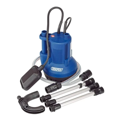The Draper Submersible Water Butt Pump with Float Switch - 350W is the perfect tool for emptying water butts when watering plants. It is versatile thanks to the three-piece aluminium swan neck extension pipe and snap-on connector included with the pump. This product also features a convenient float switch that automatically turns off the pump once the water level has dropped.Features & Benefits: Draper Submersible Water Butt Pump with Float Switch - 350W, Extension pipe and connector included, Automatic float switch, Approx 10m cable, Maximum head height of 11mProduct Specification, Power Supply: 230V, Hose Adaptor Diameter: 19mm, Max Head Height: 11m, Max Output: 40L/min, Max Particle Diameter: 3mm. Draper Submersible Water Butt Pump with Float Switch - 350W Draper Tools