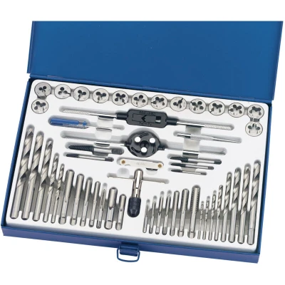 Manufactured from carbon steel. Taps and dies suitable for cleaning and cutting threads on mild steel and aluminium. Supplied with the correct drill bits for tapping. Contents held in plastic insert within steel storage case. Carton packed.