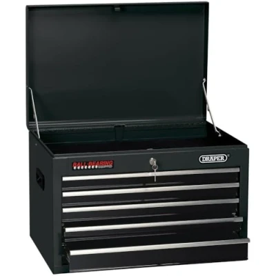 General description This 26-Inch Heavy-Duty Tool Chest by Draper features 5 drawers made from sheet steel with a durable powder-coated finish and aluminium effect trim. It provides organized storage for tools and accessories, making it suitable for both professional and DIY use. The chest is designed with smooth-operating ball bearing runners on each drawer and protective foam liners to prevent tool damage. Additionally, it is equipped with heavy-duty carry handles for easy transportation and a secure locking system with two keys for safety and security. Technical specifications Material: Sheet steel with powder coating Finish: Powder-coated with aluminium effect trim Number of drawers: 5 Drawer configuration: 4 drawers measuring W 570 x D 410 x H 48mm, 1 drawer measuring W 570 x D 410 x H 74.5mm Overall dimensions: W 660 x D 445 x H 430mm Drawer runners: Ball bearing for smooth operation Additional features: Foam liners, heavy-duty carry handles, integral locking system with two keys