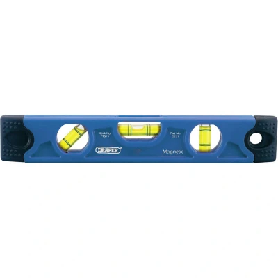 General description This Draper 230mm Torpedo Level features a durable ABS plastic construction and a magnetic base, making it ideal for various leveling tasks. It includes three vials for horizontal, vertical, and 45° measurements, ensuring precision and versatility in use. Technical specifications Material: ABS plastic Length: 230mm Vials: One horizontal, one vertical, and one 45° Vial sensitivity: 0.1° Level accuracy: 1.75mm/M = 0.57° in standard position Other information Features a V groove in the top for added functionality Includes rubber end caps and a hang hole for easy storage Display packed