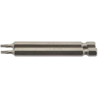 General description This set includes two T8 1/4-inch hex insert bits with a 75mm length, designed for use with TX-STAR screw heads. Made from durable chrome vanadium steel, these bits are hardened and tempered for long-lasting performance. Technical specifications Material: Chrome vanadium steel Finish: Shot blast Type: TX-STAR insert bit Size: T8, 1/4-inch drive, 75mm length Quantity: 2 pieces per set Compatibility and accessories Compatible with tools that accept 1/4-inch drive bits Designed for use with TX-STAR screw heads Installation Insert the bit into a compatible screwdriver or drill with a 1/4-inch drive Ensure it is securely fitted before use Usage Use for driving or removing TX-STAR screws Suitable for DIY, home improvement, and professional applications