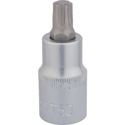 General description This is a high-quality 1/2 inch square drive socket bit designed for use with TX-STAR® (Torx) fixing systems. It is suitable for professional and DIY applications, providing reliable performance and durability. Technical specifications Model: T50 x 55mm Drive Size: 1/2 inch square Type: TX-STAR® socket bit Material: Hardened and tempered chrome vanadium steel Bit Material: S2 silicon steel with sandblasted finish Additional Features: Knurled ring for extra grip Compatibility and accessories Compatible with TX-STAR® (Torx) fixing systems Designed to fit standard 1/2 inch drive tools Installation Insert the socket bit into a compatible 1/2 inch drive ratchet or wrench Ensure the bit is securely seated before use Usage Use with appropriate torque to tighten or loosen Torx screws Ideal for assembling or disassembling components with TX-STAR® fasteners