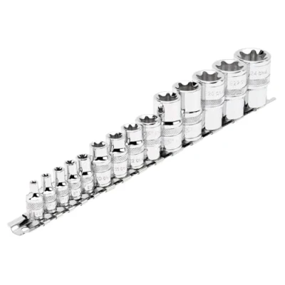 General description High-quality socket set made from chrome vanadium steel, designed for durability and strength. Hardened and tempered with a polished finish for long-lasting performance. Supplied on a socket retaining bar for easy organization and handling. Technical specifications Material: Chrome vanadium steel Finish: Polished Includes: Socket retaining bar Compatibility and accessories Compatible with Torx fixing systems Installation Insert the socket onto the appropriate drive tool. Secure the socket on the retaining bar for storage and organization. Usage Use for tightening or loosening Torx screws and bolts. Ideal for professional and DIY applications requiring durable and reliable tools.