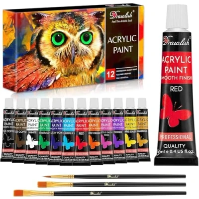 Drawlish Acrylic Paints Set of 12 with 3 Paint Brushes & (12ml) Tubes Highly Pigmented Fabric Ideal for Canvas, Wood, Ceramic, Glass Rock Painting