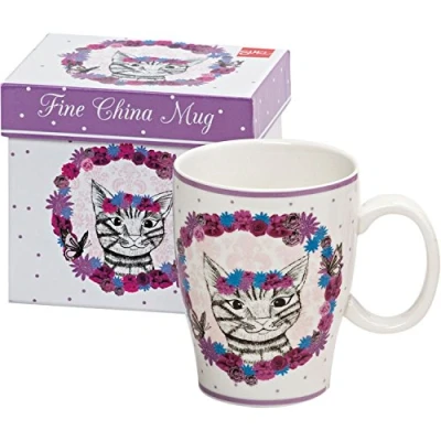 12fl oz fine china elegantly shaped mugs each featuring a hand illustrated creature on a baroque background, framed with an elaborate floral wreath Each mug is presented in a matching glossy 2 piece gift box