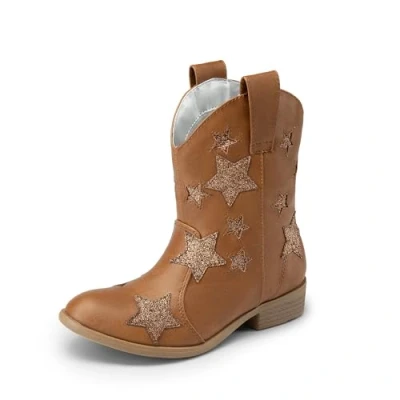 Chic & Practical: Add a touch of western charm to her wardrobe and ensure she can enjoy various activities without sacrificing practicality. These boots with glitter stars are an excellent choice All-Day Comfort: These western boots feature a skin-friendly cloth lining and a cushioned latex insole, ensuring comfort during play and other outdoor activities. Easy On & Off: Designed with pull loops on both sides, these cowgirl boots make it a breeze for your little one to slip into, promoting a sense of independence and adding joy to every outing. Flexible & Lightweight: The lightweight and flexible TPR outsole facilitates natural and unrestricted movement, making it perfect for all-day play. Season-Ready Style: These cowgirl boots complement jeans, shorts, or dresses flawlessly, making them perfect for farm adventures, forest expeditions, stage performances, or stylish strolls through the park.