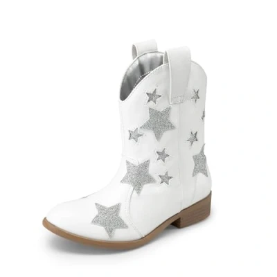 DREAM PAIRS Girls Cowgirl Boots Cowboy Western Mid Calf Star for Kids,Size 11 Little Kid,White,SDBO2405K