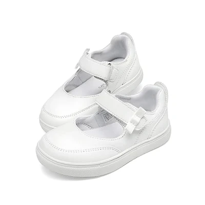 NOTE: Size indicates on outsole and shoes tag as US size, for UK size information please refer to the size chart. Versatile Style: These Mary Jane sneakers for girls are for any occasion, whether it's a day at school, a wedding, a party, or just everyday wear. Convenient Design: These flat shoes for toddlers are simple to put on and take off thanks to the cute hook-and-loop strap that's adjustable. Soft Insole: The thick and soft insole provides all-day cushioning comfort and support when they’re out and about having fun. Anti-Slip Outsole: The flexible and durable TPR outsole provides grip and stability and is also ideal for growing feet.