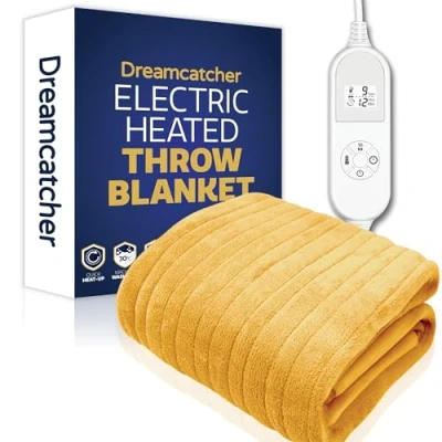 Material & Energy Saving: The Dreamcatcher gold heated throw blanket is made from high quality micro fleece polyester, the incredibly silky, smooth and soothing surface on both sides provides a soft and comfortable touch perfect for sofas or beds. Its nice stitching and feel so you can enjoy a comforting and cozy experience with our electric throw blanket. Our heated blanket as a running cost as low as 3p per hour based on current UK Energy Tariff, making it a better choice over electric heaters. Dimensions: The Dreamcatcher heated blanket as a generous size of 160 x 120cm perfect to cover your feet up to shoulder level, making this perfect for using this throw at your desk, on your sofa or even in bed. Weight 1.5kg, it comes with a 2m length power cable and a standard UK 3 pin power plug. 12HR Timer & 9x Heat Settings: With the Dreamcatcher heated blanket throw you can have peace of mind if you fall asleep or forget to unplug your electric blanket throw. With the updated controller the digital controller comes with a 12 hour timer function, which will turn off when it reaches the time you selected. Also comes with 9x adjustable heat settings, so you can control the temperature which you desire for your own comfort and comes with the added advanced overheat protection system. Machine Washable: Our Dreamcatcher electric blankets remote controller and cable is fully detachable, which enables you to easily machine wash your electric blanket at 30 degrees for your convenience. Meaning you can enjoy the clean and fresh electric heated throw’s soft fleece fabric for years to come. (Just make sure to the controller is removed before washing). Exceptional UK Customer Service & Safety: With our outstanding customer support and swift parts and replacement delivery, we are here to assist you. If you have any questions, feel free to reach out to us. Also all our electric blankets have been tested to meet all UK & European safety standards and therefore hold the UKCA and CE mark.