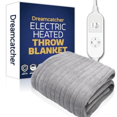 Dreamcatcher Silver XL Heated Throw Electric Blanket, 180 x 130cm Blanket Machine Washable Soft Fleece Overblanket with 12HR Timer and 9X Control Heat Settings