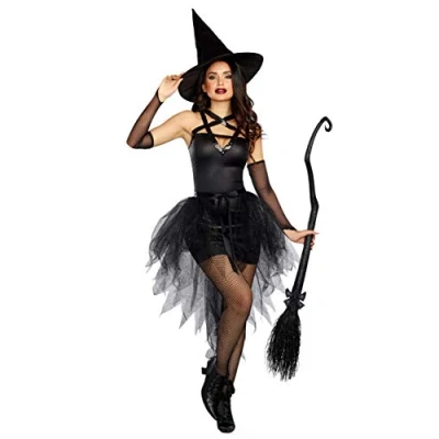 Includes removable, high-low, sparkly tulle skirt, mesh fingerless gauntlet gloves and tall witch’s hat. (Four-Piece Set) (Broom and fishnet stockings not included.), Manufacturer: Dreamgirl