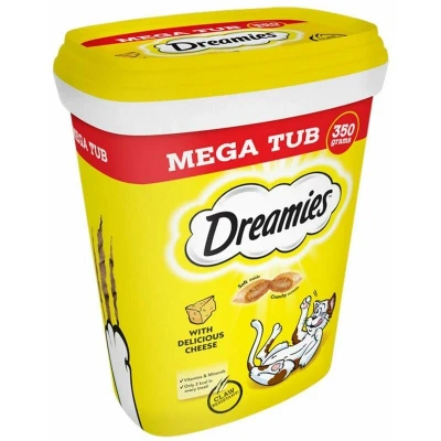 ManoManoGeneral description Dreamies Treats with Cheese are delicious cat treats that come in a convenient 350g tub, sold in a pack of 2. These treats are designed to delight your feline friend with their irresistible cheese flavor.