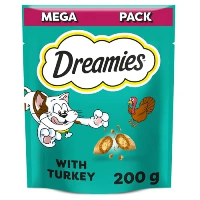 All it takes is a shake - Shake the pack and see your cat come running for the irresistible taste and texture of Dreamies Cat Treats, a reward to bring out the best side of your furry best friend Enhance all the playful moments you share with your feline friend with these dual-texture biscuits that have an enticingly crunchy outside and a soft inside that cats go crazy for These tasty treats are packed full of yummy things cats love and even contain vitamins and minerals, so you can be as happy to give them as your cat is to receive them Snack pockets are bursting with delicious turkey taste and pack a satisfying crunch - At just 2 calories per treat, your cat can enjoy up to 20 pieces per day or 6 pieces per day for your kitten Items Delivered: 1 x 200 g mega packs of Dreamies cat snacks in Turkey flavour. These pockets of cat snacks come in 5 delicious varieties including Chicken, Salmon, Cheese, Turkey and Tuna flavour