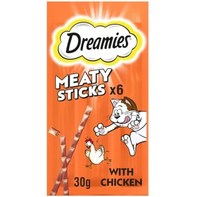 6 individually wrapped DREAMIES cat treats Meaty Sticks. 90% Meat and Animal Derivatives in every DREAMIES cat treat. Feed whole or break into smaller chunks and watch your cat pounce on these chicken cat treats! No artificial colours, grain-free cat treats recipe. DREAMIES cat treats irresistible for cats.