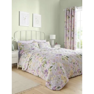 Indulge in Florette, the bedspread of modern elegance and timeless allure. With a hand-painted lilac floral print on lavender polycotton and a quilted finish, elevate your space in luxurious comfort and style. Dreams & Drapes is a trusted quality UK bedding brand, the Design range presents beautiful printed heritage floral designs and traditionally-styled bedroom furnishings Quilted 230cm width X 200cm length bedspread - Fits all bed sizes Fabric: 52% Polyester (Recycled) 48% Cotton, Filling: 100% polyester | Care: Professional Laundering Recommended, KEEP AWAY FROM FIRE Pack Contents: 1 x Bedspread