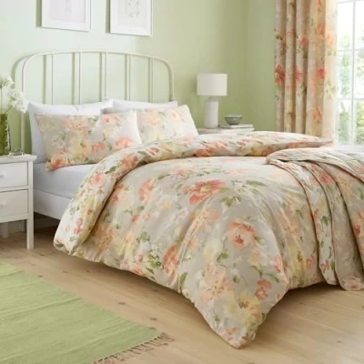 Elevate your space with sophistication and enduring charm with the D&D Florette Duvet Cover set. Showcasing a hand-painted coral floral print on natural tonal polycotton, reversible for versatility with a white base. Dreams & Drapes is a trusted quality UK bedding brand, the Design range presents beautiful printed heritage floral designs and traditionally-styled bedroom furnishings Fits a standard UK Kingsize duvet quilt size: 230cm Width x 220cm Length (97x87") - Pillowcase size 76cm x 48cm Fabric: 52% Polyester (Recycled) 48% Cotton (Thread Count - 128) | Care: Wash Before Use. Wash Dark Colours Separately. Wash Inside Out. Cool Tumble Dry. KEEP AWAY FROM FIRE Pack Contents: 1 x UK King Size Duvet Cover and matching 2 x Pillowcases