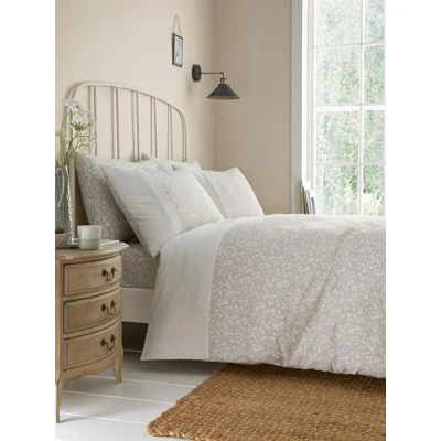Unveil Tess, a timeless symbol of elegance. Its natural Ditsy floral leaf pattern exudes grandeur. Crafted from premium polycotton, it harmonizes comfort and durability. Elevate your space with its opulent pintuck detail, offering a luxurious touch. Tess embraces coordination, enabling you to curate a refined ensemble. This beautiful collection of classically inspired prints are embellished with a selection of gorgeous trims and simple ruffles to create a stunning, tranquil bedding range. The designs are all produced using blended, soft touch fabrics that offer incredible value for money yet are easy to care for. Fits a standard UK Double duvet quilt size: 200cm Width x 200cm Length (79x79") - Pillowcase size 76cm x 48cm Fabric: 52% Polyester (Recycled) 48% Cotton (Thread Count - 144) | Care: Wash Before Use. Wash Dark Colours Separately. Wash Inside Out. Cool Tumble Dry. KEEP AWAY FROM FIRE Pack Contents: 1 x UK Double Duvet Cover and matching 2 x Pillowcases