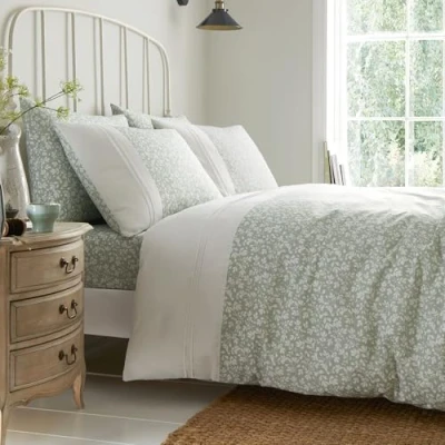 Unveil Tess, a timeless symbol of elegance. Its green Ditsy floral leaf pattern exudes grandeur. Crafted from premium polycotton, it harmonizes comfort and durability. Elevate your space with its opulent pintuck detail, offering a luxurious touch. Tess embraces coordination, enabling you to curate a refined ensemble. This beautiful collection of classically inspired prints are embellished with a selection of gorgeous trims and simple ruffles to create a stunning, tranquil bedding range. The designs are all produced using blended, soft touch fabrics that offer incredible value for money yet are easy to care for. Fits a standard UK Single duvet quilt size: 140cm Width x 200cm Length (53x79") - Pillowcase size 76cm x 48cm Fabric: 52% Polyester (Recycled) 48% Cotton (Thread Count - 144) | Care: Wash Before Use. Wash Dark Colours Separately. Wash Inside Out. Cool Tumble Dry. KEEP AWAY FROM FIRE Pack Contents: 1 x UK Single Duvet Cover and matching 1 x Pillowcase