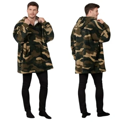 Time to relax with our Dreamscene camo print hoodie blanket, expertly crafted with a soft sherpa lining, elastic cuffs and an easily accessible two-sided giant pocket for all your needs, whilst you watch TV, lounge or work from home. Allows for warmth and comfort, whilst also being durable in all conditions. Colour: Camo Green Khaki, all complete with ivory Sherpa lining and colour matched cuffs and pockets Size: One Size Fits All - 72" Waist, 34" Body, 36" Arms, Suitable for all sizes and ages, due to the oversized design. Ideal to use whilst camping, travelling, or just relaxing around the house Made with a ultra soft plush microfibre outside with elasticated cuffs, and a soft sherpa inside and on the lining of the hood, for additional comfort whilst sleeping and relaxing. Due to the one size element and our versatile colour variety, this item is perfect to send as a gift to friends or any family member - adults, boys, girls, kids, men, teenagers, women. Easy care - machine washable: this item can be machine washed at 30°C, which can be perfect for any spills or accidents